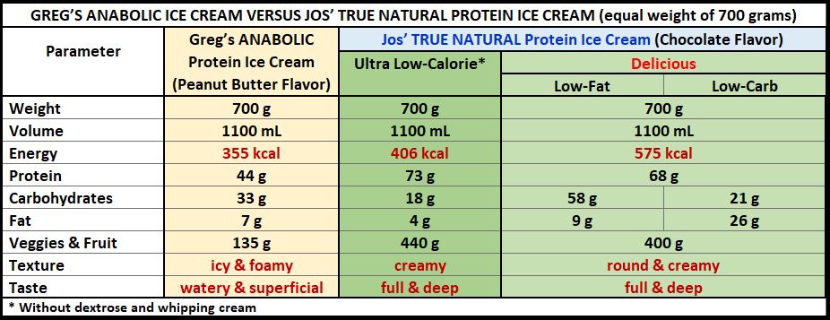 I'm sure, for someone like Greg, who stays year-round at a very low bodyfat percentage, and thus is always very hungry, the Anabolic Protein Ice Cream will taste more than good enough. But for ordinary people like you and me, who don't always need to follow a very low-calorie diet to stay below 10% bodyfat, the extra calories that come with the True Natural Protein Ice Cream are a price we are happy to pay, for the ultimate taste experience. And don't forget that the True Natural Protein Ice Cream has only one third of the calories of ordinary ice cream, 3 times less carbohydrates, 4 times less fat, and 3 times more protein.