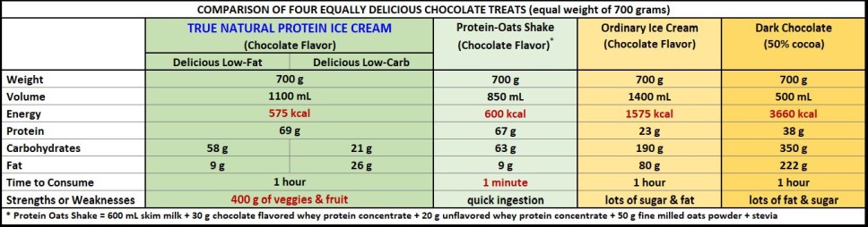Now let's see how my True Natural Protein Ice Cream compares to other overly delicious treats. Let's compare my chocolate flavored True Natural Protein Ice Cream to 3 other chocolate sensations: a chocolate flavored protein-oats shake, an ordinary chocolate flavored ice cream, and pure dark chocolate. I have put the characteristics of these 4 chocolate treats next to each other in the following Table 4, assuming an equal weight of 700 grams for ease of comparison. As you can see, the nutritional values of the protein-oats shake are almost identical to those of the True Natural Protein Ice Cream. However, as mentioned before, it takes only a minute to drink the shake, while it takes up to an hour to eat the same amount of protein ice cream. When comparing the True Natural Protein Ice Cream to the ordinary ice cream, you see that the ordinary ice cream contains almost 3 times more calories, 3 times more sugar and fat, and 3 times less protein. For pure dark chocolate, the comparison is even much more dramatic. Yet, the True Natural Protein Ice cream provides and equal amount of chocolate pleasure (1 hour), and even contains 400 grams of healthy veggies and fruit. It's up to you to decide what's the best choice for yourself.
